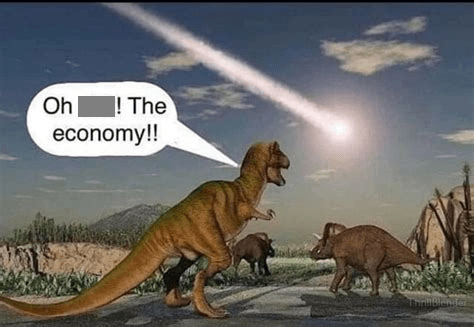 Above is a picture of a dinosaur panicking about the economy when seeing a meteor coming overhead. The joke is that, during a potential extinction-level crisis, the dinosaur is expressing concern for the economy, which is conveyed as though its priorities are misplaced. The joke circulated during the coronavirus epidemic as a jab towards those expressing concern about the state of the economy during an epidemic where people are getting sick, as though their priorities are similarly misplaced.
