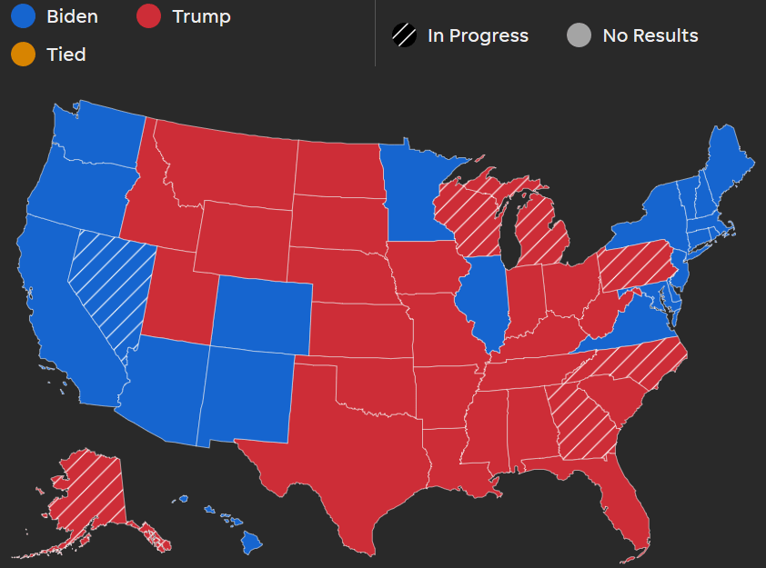 Polling has closed, and most of the votes have been counted, but Trump has a strong lead in the remaining battleground states, with the exception of Nevada, which leans Biden, and Wisconsin, which is close. Trump has taken the important state of Florida, a state which has sided with the winner of presidential elections since 1996.