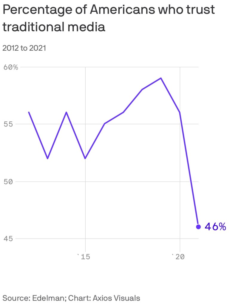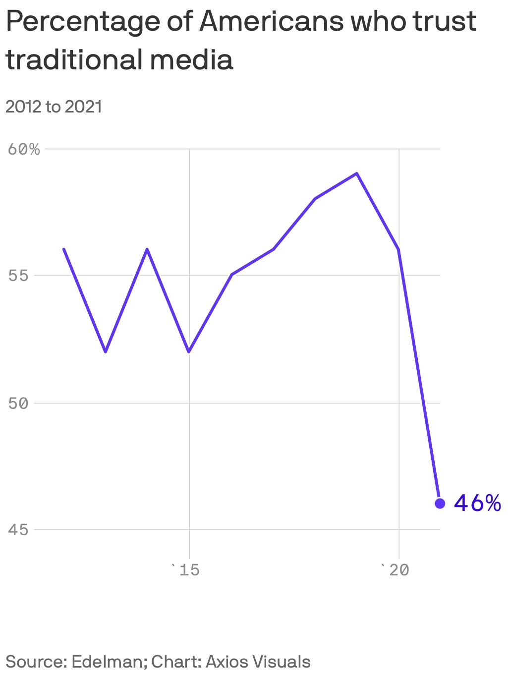 Meanwhile, back in reality, Axios reports (21 Jan 2021) that trust in news media has fallen to an all-time low, as illustrated by the following graph: