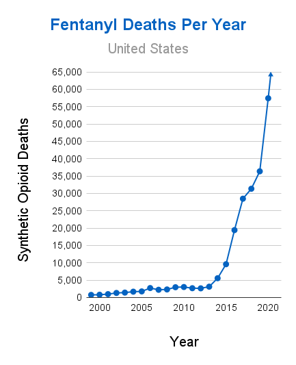 The synthetic opioid has killed over 64,000 Americans this year alone, surpassing suicide, Covid, and car accidents. As the group also points out, the fatality rate has doubled over the course of the last couple years.