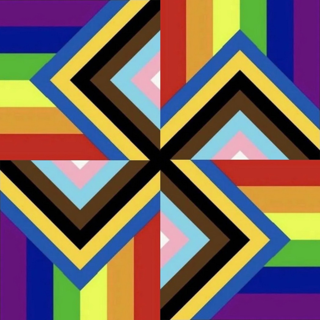 However, as it is, the current flag doesn’t adequately express the true virtues of the pride community. For one thing, the pride community prides themselves on group action. Thus, their flag would better represent them with a pattern of four similar flags. What’s more, the pride community is about togetherness in embracing superficial differences. Therefore, it’s appropriate that these four similar patterns be arranged in a manner representative of arms encircling.
