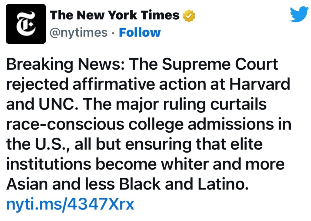 In a 6-3 decision, the US Supreme Court has just ruled that Affirmative Action programs are unconstitutional, and a violation of the 14th Amendment.