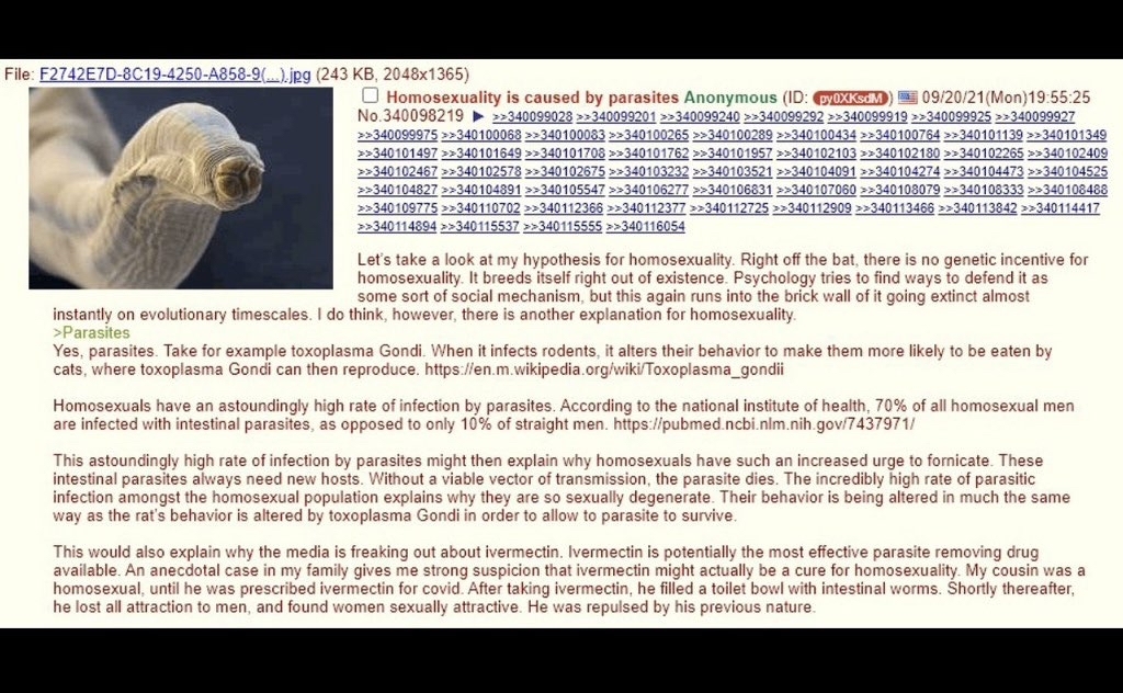 This would also explain why the media is freaking out about ivermectin. Ivermectin is potentially the most effective parasite removing drug available. An anecdotal case in my family gives me strong suspicion that ivermectin might actually be a cure for homosexuality. My cousin was a homosexual, until he was prescribed ivermectin for covid. After taking ivermectin, he filled a toilet bowl with intestinal worms. Shortly thereafter, he lost all attraction to men, and found women sexually attractive. He was repulsed by his previous nature.