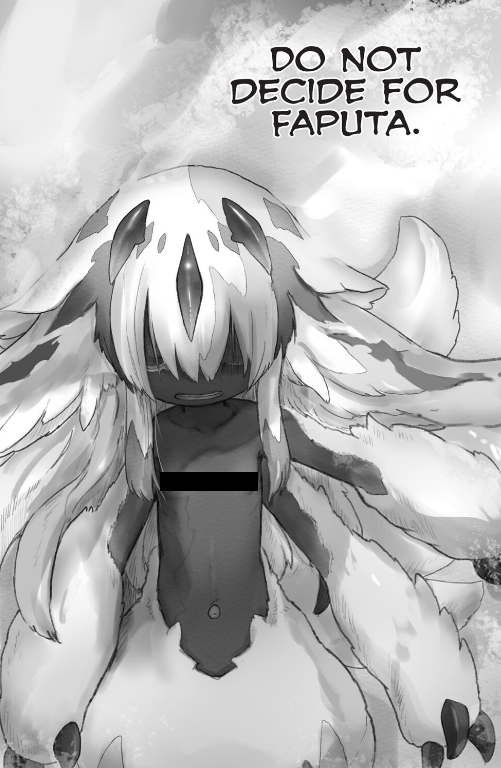 It’s great to see Nanachi back in the action, but it’s mainly Belaf who intervenes between the two of them, and the bunny doesn’t seem to contribute much. Which lends to the fan theory that Ilblu was originally intended to be Nanachi’s point of departure, but Tsukushi changed his mind when he saw how popular the character became.
